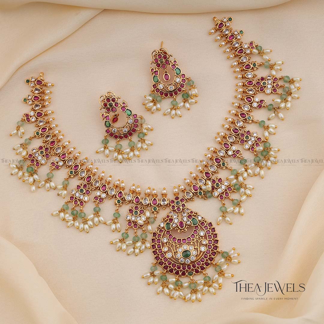 - Product Finish : Antique Gold Finish, Premium Green Beads, Pearls, Red Stones, White Stones, Green Stones