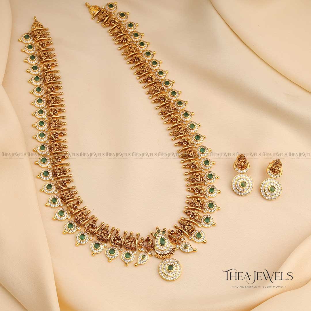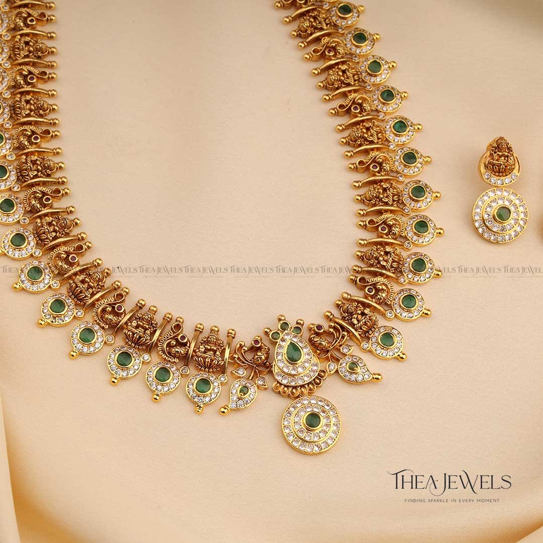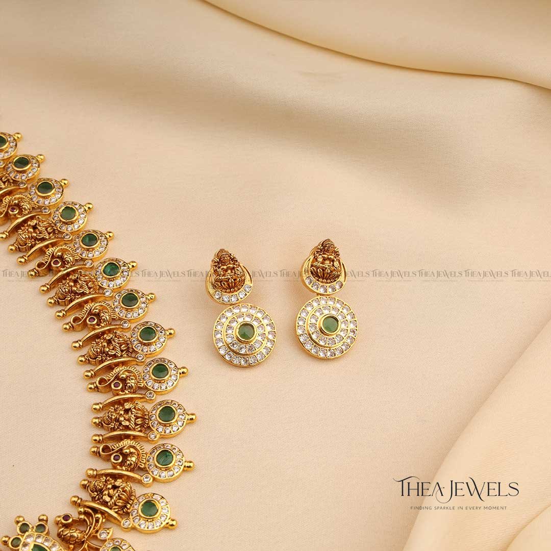 - Product Finish : Antique Gold Finish, Premium Detailing and Intricate Workmanship, Green Stones, White Stones