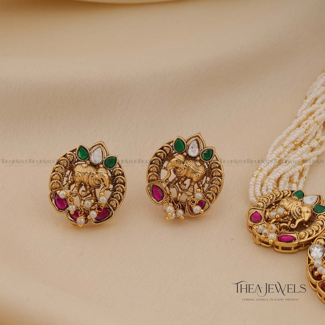 - Product Finish : Antique Gold Finish, Red Stones, Green Stones, White Stones, Gold Beads, Pearls