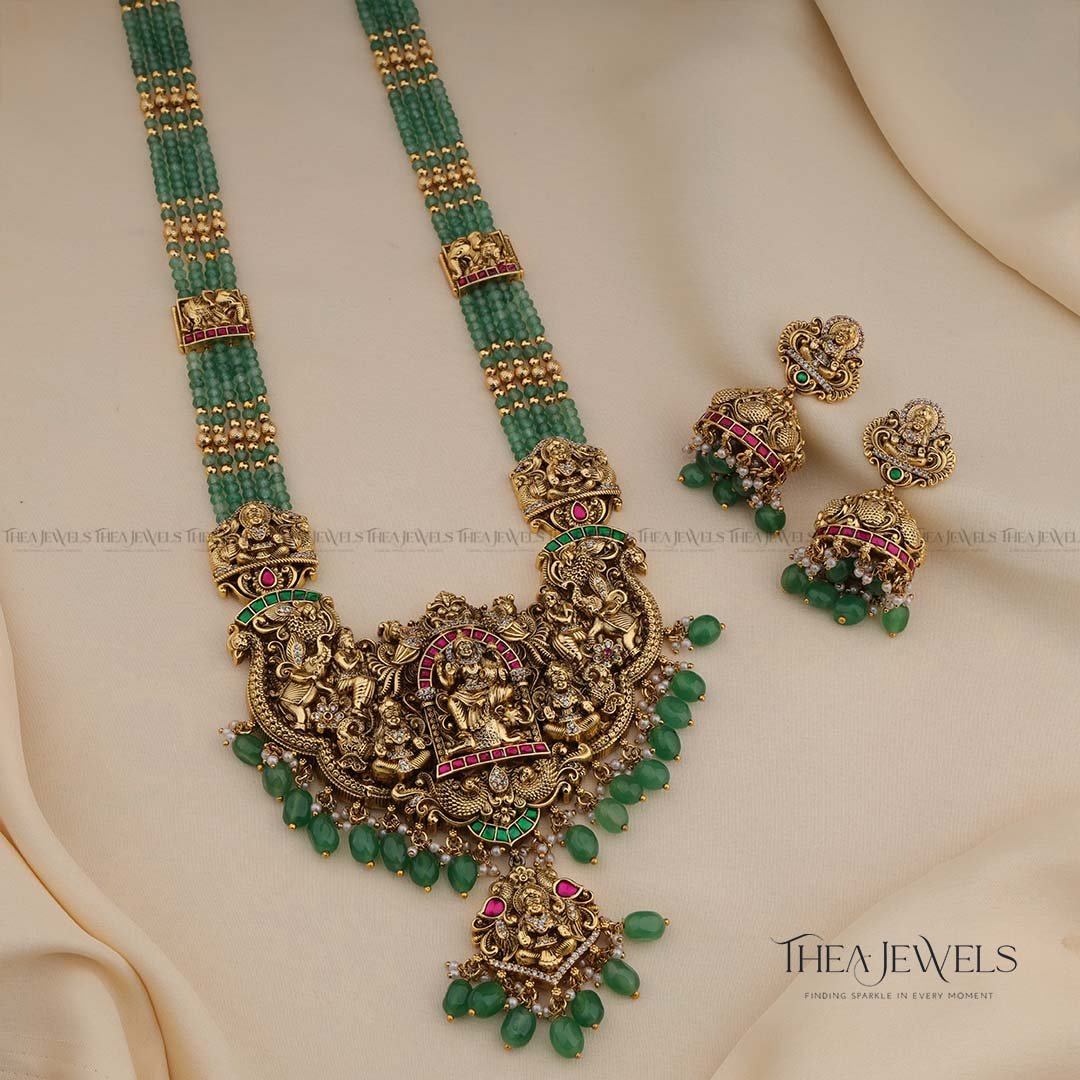 - Product Finish : Antique Gold Finish, Premium Detailing and Intricate Workmanship, Red Stones, Green Stones, Green Beads, Gold Beads, Pearls